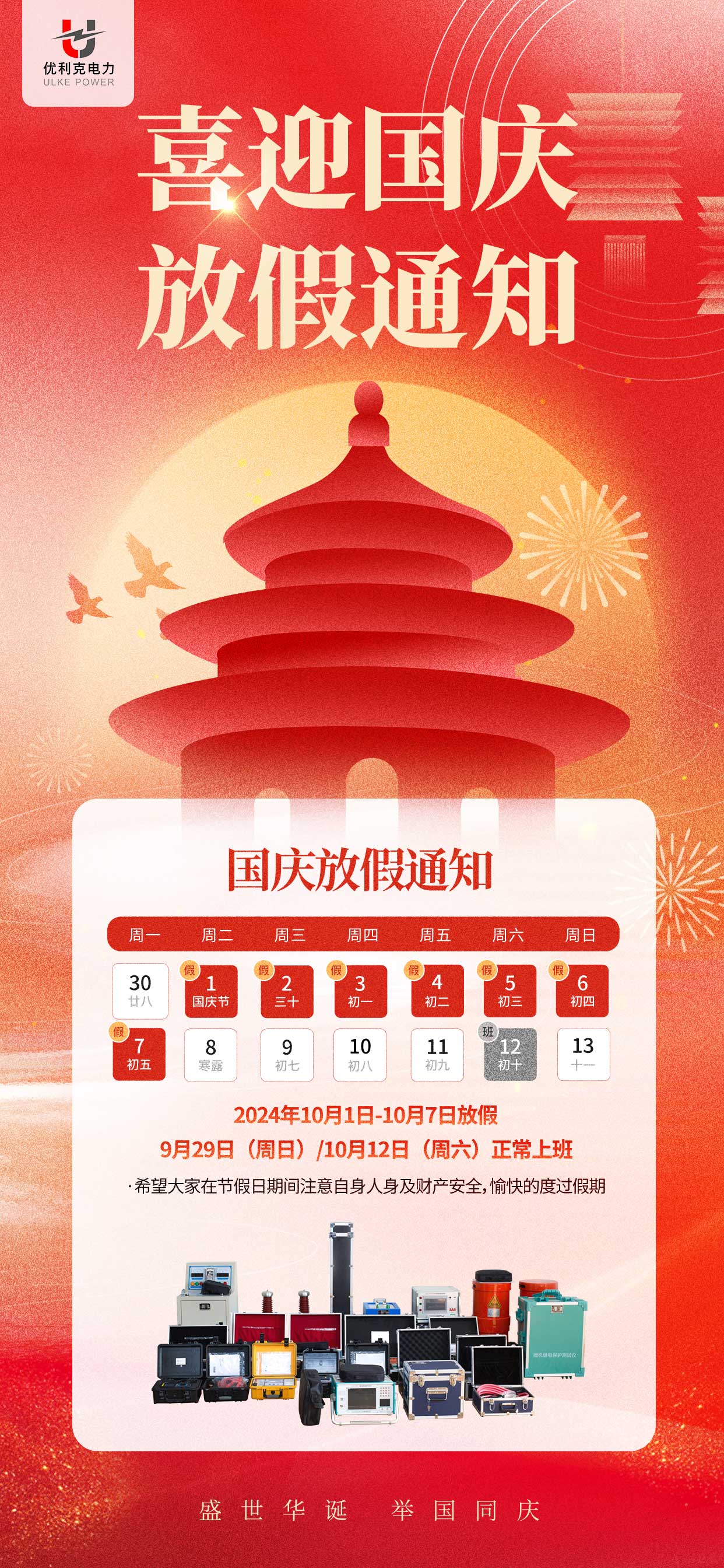 在此,優(yōu)利克電力設(shè)備有限公司全體同仁預(yù)祝您國慶節(jié)快樂,萬事如意!